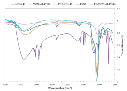 The spectra in Fig. 3 compares the materials obtained. For MCM-41, the characteristic bands located at 1055 cm-1 and 807 cm-1, which are associated with Si-O-Si and Si-O stretching vibrations, respectively, can be observed. The band observed at 963 cm-1 is assigned to Si-OH stretching, while the absorption band at 1632 cm-1 corresponds to the deformation vibrations of adsorbed water molecules (δH-O-H). The presence of the broad band at 3100-3600 cm-1 is attributed to O-H stretching at the surface due to silanol groups with hydrogen bonds and remaining adsorbed water molecules [23]. In the FT-IR spectrum of the sample modified with Polystyrene Sulfonic Acid (PSSA), the absorption bands at 1601 cm-1 and 1493 cm-1, characteristic of C=C stresses are appreciated, in the range from 3082 to 2921 cm-1 are associated with C-H stresses, while at 1030 cm-1, the stretching stress corresponding to the S=O bond at 1171 cm-1 is related to sulfonic group stress (SO3) [24]. The band at 755 cm-1 is associated with the C-S bond strain, the S-O bond vibration appears at 696 cm-1, and the broadband at 3405 cm-1 is due to the O-H bond [25]. The FT-IR spectrum of the functionalized MCM-41-PSSA (Fig. 3) shows the characteristic bands of both compounds; the intense band at 1067 cm-1 is associated with Si-O-Si stretching vibrations, characteristic of the mesoporous material, whereas the bands of PSSA are located at 2981 cm-1, corresponding to C-H vibrations, the band at 1643 cm-1 is associated with C=C vibrations of the aromatic ring, and the band at 963 cm-1 is attributed to S-O stretching [19,26]. Both MCM-41 and PS-MCM-41 were calcined before FT-IR tests, and it can be said that there was no significant difference between the infrared spectra of both materials; the PSSA-functionalized samples were not calcined.