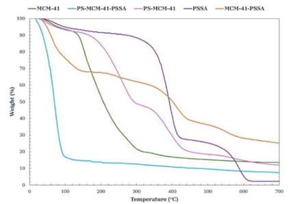According to the thermogram shown in Fig. 4, in the weight loss curves of uncalcined MCM-41, five maxima in the weight loss rate (peak 1-5) are appreciated: peak 1 centered at 61.77 °C is associated with physically adsorbed water constituting 2.5 % of the weight loss; peak two at 152.21 °C is related to the decomposition of the compound that forms the template director of the structure, cetyltrimethylammonium bromide (CTABr) up to this point, there is a 15.27 % weight loss; peaks 3 and 4 at 184.35 °C and 281 °C, respectively, are attributed to the combustion of remaining carbon species, such as residual carbon or deposited carbon, having a cumulative weight loss of 59.46 %; and finally, peak 5, located at 350.03 °C corresponds to the dehydroxylation of the silanol groups, having a total weight loss of 64.97 % [27]. In the PSSA thermogram (Fig. 4), at 55.72 °C, a mass loss of 3.04 % was observed due to evaporation of the water in the sample. The second transition region was observed at 393.95 °C due to the degradation of the sulfonic group (-SO3), also called desulfonation; the loss at this temperature is 54.42 %, and the peak of the third transition is present at 567.74 °C is the result of the side chain cleavage of the PSSA polymer, with a total weight loss of 90.47 % [28]. The thermogram obtained from the functionalized material MCM-41-PSSA (Fig. 4) shows its mass loss peaks: the first one at 69.09 °C is associated with the evaporation of water molecules present due to the interactions with the sulfonic groups, representing a loss of 10.95 % by weight; the second peak located at 239.14 °C is due to the loss of the -HSO3- groups, reaching 24.22 % loss by weight; the third peak located at 299.31 °C is due to the decomposition of the polymeric chain, reaching 24.95 % loss by weight; finally, the fourth peak at 454.97 °C is associated with the dehydroxylation of the silanol (Si-OH) groups and the decomposition of the PSSA side chain, resulting in a loss of 26.29 % by weight of the total sample [24,27,29]. The thermogram of the material with incorporated polystyrene PS-MCM-41 (Fig. 4) showed an improvement in thermal properties compared to the source material MCM-41; three losses were identified: one at 46.42°C associated with 1.29% water remaining in the material, a second loss at 262.91 °C related to the decomposition of the structuring agent (CTABr), and a third loss at 380.49 °C corresponding to the dehydroxylation of the silanol groups, associated with 38.56 % by weight of the total mass. In the case of the PS-MCM-41-PSSA material (Fig. 4), a significant mass loss was appreciated at 69.54 °C associated with the evaporation of adsorbed water, representing 25.51 % of the total mass, a second loss located at 173.44 °C, corresponding to 42.93 %. It was associated with the degradation of the anchored PSSA. TGA tests for MCM-41 and PS-MCM-41 were performed on uncalcined materials.