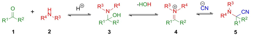 Strecker reaction was performed for the first time by Adolph Strecker in 1850. This 3CR allows the synthesis of α-aminonitriles 5 (Scheme 1) as result of condensation between a carbonylic compound 1 and an amine 2 (e.g., primary or secondary amines, or ammonia) to afford aminoalcohols 3 which after a dehydration performed iminium ions 4, followed by the addition of a cyanide source (HCN, TMSCN, etc.) in the same reactor to give the compounds 5. Moreover, it is known an asymmetrical version of this coupling consisting of sequential combinations of chiral imines, carbonylic components, and cyanide anions but using organocatalysts or chiral metal-based compounds as catalysts to achieve enantio-enriched mixtures of α-aminonitriles. The α-aminonitriles are adequate precursors of α-amino acids. This 3CR owing to its simplicity and atomic economy is appropriate for further transformations [10].