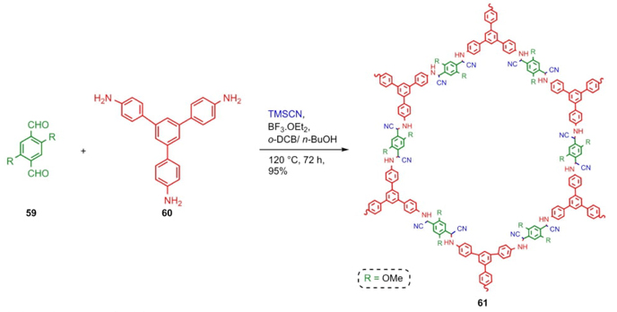 Covalent Organic Frameworks (COFs) belong to a special type of crystalline porous materials, that have caught the attention of synthetic and material chemists for their applications such as catalysts or gas storage materials [20]. The approach of Chen, Dong et al. involved a mixture of aromatic aldehydes 59, amine 60, and TMSCN catalyzed by a Lewis acid to afford the products 61 in 95 % yield (Scheme 10) [21]. There are currently a few examples of COFs designed and synthesized through multicomponent reactions due to their complexity, but these methods turn out to be good choices for the preparation of these types of materials.