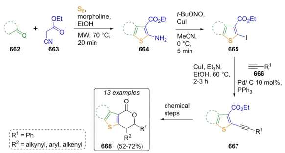 Pal et al. developed a methodology to synthesize anticancer agents containing the fused-type bis-heterocyclic thieno[3,2-c]pyran-4-one core [123]. Thus, the synthesis of the 2-aminothiophenes 664 as key reagents were carried out via a Gewald reaction through a sequential combination of cyclic ketones 662, ethyl cyanoacetate (663), and elemental sulfur. Further transformations involved Sandmeyer iodination to give compounds 665, cyclization promoted by iodide, and various C-C couplings catalyzed by palladium-based reagents from alkynes 666 achieved the compounds 667, and the products 668 (Scheme 100). The thiophene ring is the key fragment in this strategy because it was found in several biological active compounds. Gewald reaction allows often incorporating thiophene fragments in short reaction times and high yields.