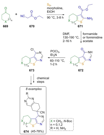 Parsa, Pal et al. developed a multistep methodology to prepare a series of fused-type thieno[2,3-d]pyrimidines 674, that include a Gewald 3CR as the first and key step. Synthesized compounds were evaluated as inhibitors of PDE4 enzyme [124]. Thus, cyclic ketones 669, ethyl cyanoacetate (670), and elemental sulfur were combined in morpholine to afford the products 671, which performed a ring closing promoted by formamide or formimidine acetate to give the products 672. Besides, compounds 673 were constructed by treatment of polyheterocycles 672 with stoichiometric amounts of POCl3. After a few further chemical steps, it was accomplished the synthesis of the target compounds 674 (Scheme 101). As seen, Gewald reaction acts as the key step in constructing thieno[2,3-d]pyrimidine core, which is present in a relatively wide variety of bioactive compounds, even in some current drugs.