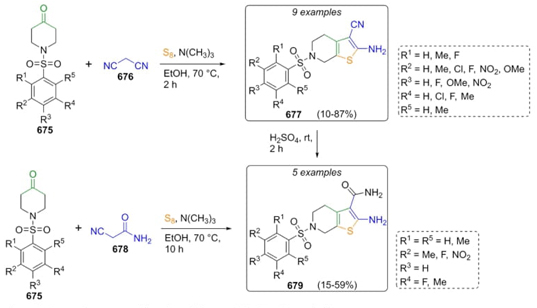Kanizsai et al. developed in 2019 a synthetic strategy to obtain novel β-aminonitriles, for instance the 4,5,6,7-tetrahydrothieno[2,3-c]pyridines 677 and 679 via a Gewald reaction [125]. These compounds were evaluated as antitumoral by tyrosine-kinase inhibition. Thus, piperidones 675, malononitrile (676), and elemental sulfur were mixed under basic conditions to assemble the compounds 677 in moderate to good yields (10-87 %) (Scheme 102). Also, a few compounds 677 were hydrolyzed toward the formation of their amide-analogues 679 in moderate yields (15-59 %). A direct way to synthesize compounds 679 using a Gewald reaction was by combining the piperidones 675, cyanoacetamide (678), and elemental sulfur. This last pathway is less efficient than the procedure in two steps. In other way, products 677 and 679 have a potential antitumoral activity due to influence of N-sulfonyl pharmacophoric fragment.
