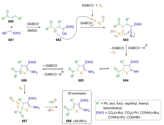 Nguyen, Mac et al. worked in 2021 on the synthesis of 2-aminothiophenes through a Gewald reaction [126]. Thus, α-cyanoacetates 681, chalcones 680, and elemental sulfur were combined under basic catalytic conditions to provide the 2-aminothiophenes 688 in moderate to good yields (48-86 %). Authors proposed a plausible mechanism where the first step was a nucleophilic attack of cyanoacetates 681 to chalcones 680 producing the anions 682 (Scheme 103). Steric hindrance inhibits Knoevenagel condensation as the first step. Then, DABCO-sulfur complex was attacked by anions 682 affording the products 683, which were cyclized to give the tetrahydrothiophenes 684 and came into equilibrium with dihydrothiophenes 685. Finally, an aromatization process occurs from compounds 686 and then 687 due to the presence of elemental sulfur to produce compounds 688. The sulphuration process is favored in the cis intermediate due to steric hindrance. The regioselectivity was promoted by appropriate chalcones. Moreover, there are no reports about the use of cyanoacetates and chalcones as starting materials in Gewald-type processes.