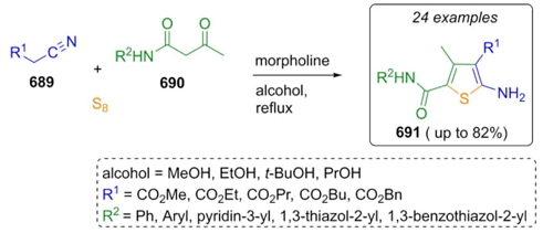 Yeh, Tsai, Lee et al. reported the synthesis of many thiophenes via a Gewald reaction, as well as the evaluation of synthesized compounds as Cisd2 (CDGSH iron sulfur domain 2) protein activators that cause childhood diabetes. [127]. A sequential combination of methylene-activated amides 690, nitriles 689, and elemental sulfur in mild reaction conditions achieved the new thiophene derivatives 691 in moderate to good yields (8-82 %) (Scheme 104). Synthesis of compounds was focused on the effect of substituents R1 or R2 on the activator Cisd2 to potentiate their activity. In the case of substituents R1, bulky esters decrease the activity as well as groups like amide or nitrile. On the other way, R2 substituents exhibited higher activity in 3 and 4-substituted phenyl rings with electron-donating groups such as methyl or methoxy, instead electron withdrawing groups that showed lower activity.