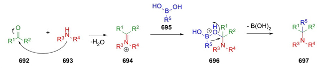 The Petasis reaction, also known as Petasis-Boron-Mannich reaction, was reported in 1993 by Nicos A. Petasis, who modified the original Mannich reaction by employing a boronic acid as a nucleophile. This three-component reaction involves a sequential combination of carbonyl derivatives with secondary amines and boronic acids. The reaction mechanism is still under discussion [128]. However, the most plausible and accepted one proceeds via a hemiaminal-type condensation between aldehydes or ketones 692 and secondary amines 693. Then, iminium ions 694 react with boronic acids 695 to give the complex 696, which through a C-C bond migration gave amine derivatives 697 (Scheme 105) [129].