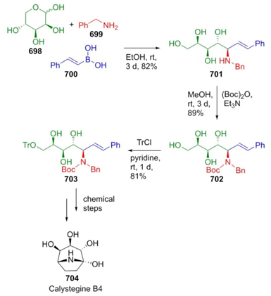 Pyne et al. reported in 2010 a procedure that allowed the total synthesis of Calystegine B4 using a Petasis reaction as the first key step [130]. Thus, a combination of (-)-D-lyxose (698) as a carbonylic compound, benzylamine (699), and boronic acid 700 afforded the product 701 in 82 % yield. Then, the amino group from compound 701 was protected using Boc to give the aminoalcohol 702, which was treated with trityl chloride to give the advanced intermediate 703. After seven additional transformations from this later, it was obtained the natural product 704 (Scheme 106). Notably, the Petasis reaction allowed obtaining stereoselectivity of the amino group, which could be used for further transformations.
