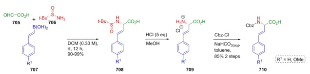 Hutton et al. reported a creative process to synthesize g,b-dihydroxyhomotyrosines through a Petasis reaction as one of keys steps [131]. Thus, glyoxylic acid (705) as carbonylic component, sulfinamide 706, and boronic acids 707 were combined to afford products 708 in good to excellent yields (90-99 %) and good diastereoselectivity. Then, compounds 708 were treated in concentrated acid media to give ammonium salts 709. Then, authors protected amino position to further transformations and completed preparation of dihydroxyhomotyrosine derivatives 710 (Scheme 107). As seen, the use of tert-butylsulfinamide in the Petasis reaction facilitated the incorporation of protective groups on the amine moiety. The olefin fragment was compatible with all conditions throughout the process, so it could be used for further transformations.