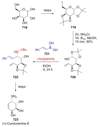 Shaw, Ghosal et al. reported in 2012 a creative methodology involving a diastereoselective Petasis reaction [133] from the carbohydrate galactose (718). Thus, iodide 719 was treated with Zn and Vitamin B12 in catalytic amounts to generate hemiacetal 720, which was combined in a one-pot process with trans-2-phenylvinyl boronic acid (721) and tert-butylamine to furnish the chiral alcohol 722, which after several chemical steps afforded the natural product (+)-Conduramine E (723) (Scheme 109). Petasis reaction was the key step to achieve in a diastereoselective way the key alcohol 722, as well as for reducing the number of synthesis steps.