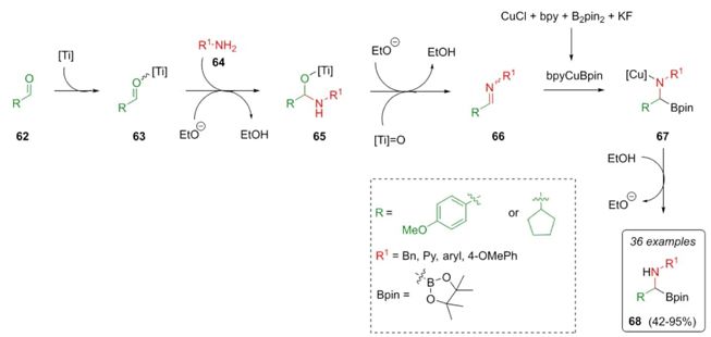 Marder et al. reported a chemoselective strategy to synthesize α-amino boronates via a new named Borono-Strecker reaction [22]. Thus, aldehydes 62 coordinate with titanium to give intermediates 63, which were combined with amines 64 in the presence of Lewis acid Ti(OEt)4 promoting imine’s 66 formation after an ethanol release in compounds 65. A proton source is necessary for the hydroboration of imines 66. This latter is due to the formation of a fluoride assisted by ethoxide anion, activating B2pin2 (bis(pinacolato)diboron) for copper transmetalation in compound 67, using MTBE as a solvent to give the α-aminoboronates 68 in moderate to good yields (42-95 %) (Scheme 11). As seen, the key idea was to use a Lewis acid together with a proton source (Brønsted acid) to avoid side reactions between carbonylic compounds and B2pin2.