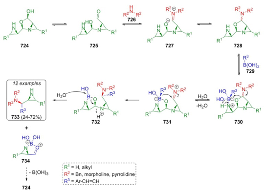 Yudin et al. reported a different approach to obtain aziridine-containing diamines via a Petasis-type reaction [134]. The mechanism proposed involves ring-openings in the substrates 724 toward aldehydes 725 as the first step. The addition of secondary amines 726 to aldehydes 725 in tautomeric equilibria with intermediates 727 promotes amine adducts 728, which in the presence of boronic acids 729 gave the hemiaminals 730. Thus, aqueous media afforded chelates 731. Si face attack is preferred over Re one to give the intermediates 732, which are hydrolyzed to yield products 733 in up to 72 %. Finally, a dimerization of the released compounds 734 may occur to recover the initial reagents 724 after losing an equivalent of boronic acid(Scheme 110). Products were synthesized in excellent diastereoselectivity (up to 95:5 ee). Through Petasis reaction, the key chelated intermediate 732 was assembled, which contributes in a high stereoselective way to form the syn products. On the other hand, the efficiency of the reaction depends on the halogenated solvent and the nucleophile used.