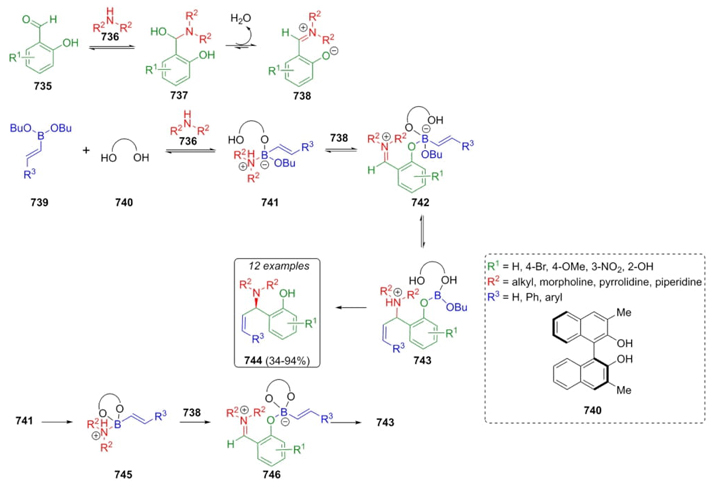 Around 2013, Shi et al. reported a version of the Petasis reaction in which salicylaldehydes 735, secondary amines 736, and vinylboronates 739 are combined sequentially under organocatalytic conditions to obtain the corresponding Petasis products in moderate to good yields (34-94 %) and in excellent enantioselectivity [135]. A plausible reaction mechanism suggests an initial formation of iminium ions 738 by condensation of salicylaldehydes 735 and amines 736. Besides, boronates 739 react with diols 740 and amines 736 under catalysis conditions to produce intermediates 741 in equilibria with 742, which were treated with preformed iminium ions 738 to afford the intermediates 743, which migrates a vinyl group after hydrolysis to finally obtain products 744 (Scheme 111). Another pathway in the formation of intermediates 746 was carried out through precursors 745 and iminium ions 738, which could be promoted by triethylamine in reaction media. Also, vinylboronates promote higher yields instead of other types of boronates such as dioxaborolanes or dioxaborinanes.