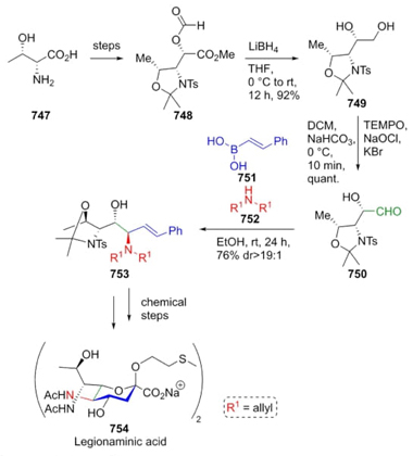 Seeberger et al. developed the total synthesis of legionaminic acid 754 using a stepwise methodology in which a Petasis reaction was the key step [136]. Synthetic procedure starts from D-threonine (747) (Scheme 112). After corresponding chemical transformations, diester 748 was treated with lithium borohydride to give the diol 749. Oxidation of compound 749 provided the less hindered aldehyde 750 as a reagent for Petasis reaction. Thus, a combination of aldehyde 750, amines 752, and styrylboronic acid (751) in ethanol afforded products 753 in 76 % yield as a diastereomeric mixture. All procedure was accomplished in eleven steps. Petasis reaction allowed obtaining products with good stereoselectivity, avoiding epimerization processes.