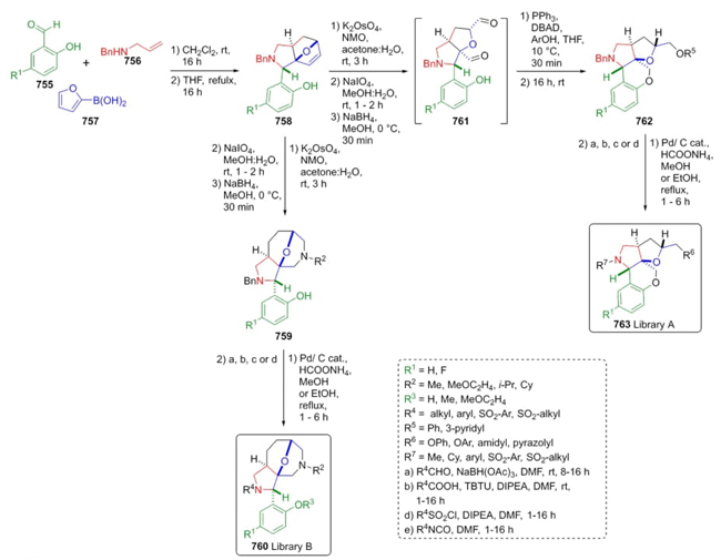 Clausen, Nielsen et al. reported a Petasis-based strategy to develop new scaffolds containing four stereogenic centers [137]. Thus, salicylic aldehydes 755, benzyl allyl amine (756), and furan-2-boronic acid (757) were reacted together to give the products 758 after a domino process Petasis / Diels-Alder cycloaddition. Then, cyclic compounds 758 were oxidized using K2OsO4 and methylmorpholine oxide affording the intermediate s759. Finally, products 760 (library B) were synthesized through a reductive cyclization promoted by osmium salt, NMO, and sodium periodate. Moreover, Library A was afforded after reduction of intermediates 761 coupled to cascade Mitsunobu conditions from precursors 762 (Scheme 113).