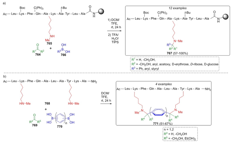 Wesjohann, Rivera et al. developed for the first time a synthetic procedure for labeling and stapling peptides via a new Petasis-type reaction without charge modifications [138]. The peptide chain was modified by protecting amino groups and linking an amino-end chain to lysine. Thus, the peptidic chain in polypeptide substrates 765 was reacted with aldehydes or ketones 764 and boronic acids 766 to afford peptide labeled on lysine side chain 767 (Scheme 114(a)). In the same way, a diversification of resin peptide was performed changing sugars such as D-erythrose or D-ribose, fluorescent peptides, or steroidal peptides instead of aldehydes. A Petasis-stapled reaction was carried out mixing resin-peptide 768, carbonylic compounds 764 or 769, and diboronic acids 770 to give peptides 771 (Scheme 114(b)). Due to polypeptide size, the authors carried out the MCR in two stages, to avoid a second Petasis reaction.