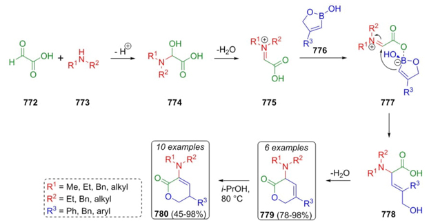 Zhang, Yang et al. reported a distinct procedure to obtain functionalized dihydropyrones via a regioselective Petasis reaction [139]. It proposed a mechanism pathway where iminium ions 775 were formed through condensation of glyoxylic acid (772) as a carbonyl compound and secondary amines 773 (Scheme 115). Oxaborols 776 were coordinated with carboxylates of 775 to achieve the intermediates 777. A further intramolecular nucleophilic attack of the vinyl moiety to iminium furnished intermediates 778, which after releasing a molecule of water achieved products 779 (78-98 %). Finally, thermal isomerization gave the products 780 in moderate to good yields (45-98 %). The authors found that its methodology cannot be applied using anilines as reagents as well as alkylic chains as substituents on the R3 position. Final isomerization processes are promoted by increasing temperature up to eighty Celsius degrees.
