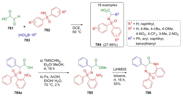 Bolm et al. reported in 2021 another approach to synthesize benzodiazepine analogues using a Petasis reaction under catalyst-free conditions as the key step [140]. With optimal reaction parameters in hand, glyoxylic acid (781), sulfoximines 782, and aryl boronic acids 783 were mixed without catalysis to afford products 784 in moderate to excellent yields (27-99 %) and diastereomeric ratio up to 1:1. Thus, product 784a was selected to perform further transformations involving esterification of its acid moiety assisted by trimethylsilyl diazomethane, and a further nitro reduction with iron in dust and acetic acid to give the precursor 785. Finally, its amidation with lithium hexamethyldisilazane promoted a ring closure to give corresponding benzothiadiazepine 786 in 55 % overall yield (Scheme 116). The authors noted that steric hindrance has no effects on the yields, except for S-alkyl substituent from sulfoximines. On the other way, electronic effects decrease the yields in alkyl-substituted S-aryl of sulfoximines.