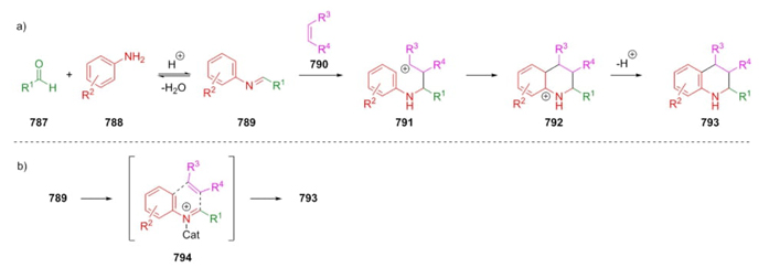 In 1967, L. S. Povarov reported the first reaction which involved a sequential combination of aromatic imines and alkenes reacting through an inverse electron demand Diels-Alder [4+2]-cycloaddition [141]. Later, this reaction was retaken and discussed into a 3-CR between aldehydes, amines, and olefins. The mechanism pathway is still under discussion, as the first step is a condensation between aldehydes 787 and amines 788 to give corresponding imines 789 in catalytic conditions. Then, two routes have been proposed (Scheme 117): a) via a Mannich addition to alkenes 790 to achieve the intermediates 791, followed by Friedel-Crafts alkylation, and finally an aromatization step to produce the compounds 793; and b) same route Mannich addition and Friedel-Crafts alkylation were carried out to construct the concerted intermediates 794, which react through a cycloaddition-type reaction to give the products 793 [142].