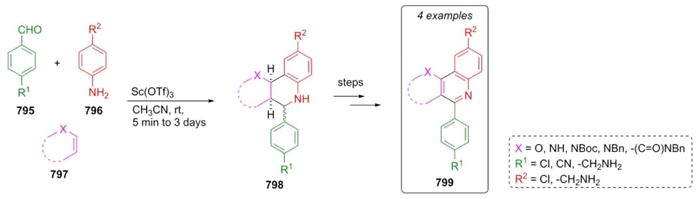 In 2015, Muñoz-Torrero et al. reported the synthesis of quinoline-derivatives using a Povarov reaction as a first key step synthesis and their biological evaluation against protozoan parasites T. brucei, T. cruzi, and L. infantum [143]. The synthetic strategy of the more active compounds begins with a Povarov reaction between corresponding aldehydes 795 and amines 796; in the case of the olefinic compounds 797, lactams, enamines, or pyrans were used. Further transformations such as oxidation with 2,3-dichloro-5,6-dicyanobenzoquinone (DDQ) reagent, protection/deprotection processes, and reduction of nitriles or lactams were carried out in each sequence (Scheme 118). To improve the activity of the compounds as well as higher bioavailability, the authors proposed a bioisosteric replacement of NH to O or the incorporation of heterocyclic rings instead of cyclic amide.