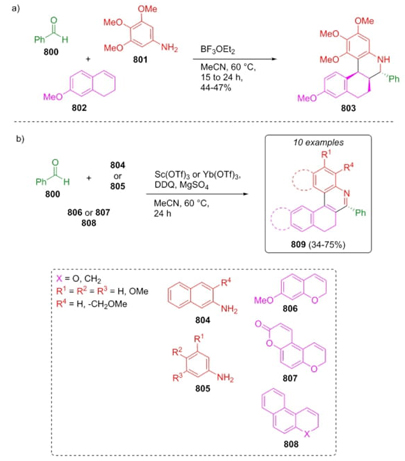 Menichetti et al. reported in 2019 the synthesis of heterohelicenes via the Povarov-oxidation process through a one-pot manner [144]. A combination of benzaldehyde (800), naphthylamines 804 or anilines 801 and 805 , and as cyclic aromatic dienophiles, alkenes or chromenes 806, 807, and 808 respectively afforded the products 803 or 809, under different reaction conditions. Reaction conditions a) it was carried out using boron trifluoride ethyl etherate as a catalyst to achieve a diastereomeric mixture cis/ trans of tetrahydroquinoline 803 in moderate yield. Then, under reaction conditions b) scandium triflate or ytterbium triflate were used as catalysts in different amounts, magnesium sulfate as an additive, and DDQ as an oxidative reagent to achieve the compounds 809 in moderate to good yields (34-75 %) (Scheme 119). The authors proposed that involved imines act as dienes to afford the compound 803 (depending on the amount of amine) but also participates into oxidations to give compounds 809. Naphthylamine directs towards products 809 regioselectively due to a-carbon or b-carbon that participates in cyclizations.