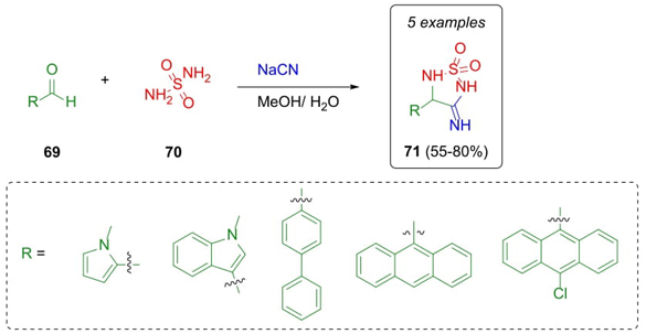 In 2022, Başkan et al. reported the synthesis and in vitro evaluation of 3-imino-sulfahydantoins on bacteria and cytotoxicity studies [23]. These compounds were prepared through a Strecker reaction by a combination of different aromatic and heterocyclic aldehydes 69, sulfamide 70, and sodium cyanide to give 1,1-dioxides 71 in moderate to good yields (55-80 %) (Scheme 12). These compounds exhibited potential antibacterial properties and cytotoxic effects on SPC212 cells related to malignant pleural mesothelioma, a type of lung cancer.