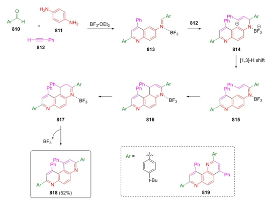 Kuwabara et al. reported in 2021 the synthesis of some new triazatriphenylenes via a double Povarov reaction [145]. Aromatic aldehydes 810, dianiline 811, and phenylacetylene (812) were sequentially combined under Boron trifluoride etherate as a catalyst, and DQQ as an oxidative reagent to afford a mixture of products 818 and 819, being 4,7-phenanthroline derivative 818 the majoritarian product (52 %). Authors proposed a mechanism pathway where the first step is the Povarov cyclization under a Lewis catalyst to give the compound 813. Then, the addition of acetylene 812 achieved zwitterionic compounds 814, which through [1,3]-H shift afforded the compounds 815. Compounds 818 were obtained after a ring closure, prototropic tautomerization, and oxidation (Scheme 120). To know about the second cyclization, DFT studies were performed and showed that in compound 815 there is a HOMO charge distribution in the a-position of the quinoline core that favored the cyclization. Also, steric repulsion from the phenyl neighboring fragment did not interfere with the cyclization process.