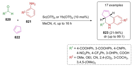 Wu et al. reported the synthesis of various new tetrahydroquinolines in 2022 which were evaluated behind their interactions with micro RNA-binding protein LIN28 and let-7 micro RNAs, both related to human tumor cells. After finding optimal conditions, a combination between aromatic and non-aromatic aldehydes 820, anilines 821, and cyclopentadiene (822) using scandium triflate or ytterbium triflate as catalysts achieved tetrahydroquinolines 823 in moderate to good yields (21-94 %) and diastereomeric ratio (up to 99:1). Based on the stereoelectronic properties of the anilines 821, mixtures of cis/ trans products or syn products as major diastereomers were obtained. Authors were inspired for this work in the compound LI71, which was previously reported [146]. The goal of synthesizing these molecules is to have greater interactions with the non-coding RNA molecules LIN28 and let-7.