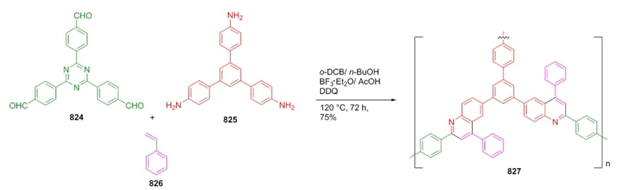 Thomas et al. reported in 2024 the synthesis of a covalent organic framework (COF) via a Povarov reaction [147]. Sequential combination of aldehyde 824, aniline 825, and styrene (826) afforded the COF 827 under Lewis acid catalysis and DQQ as oxidant in good yield (75 %) (Scheme 122). COF 827 exhibited stability under strong acids and bases. Povarov reaction allowed affording a complex product in one step. Also, the porous and crystalline rearrangement was favored due to Povarov reaction being performed after the oxidation process resulted in a π-π stacking interactions of extended frameworks.