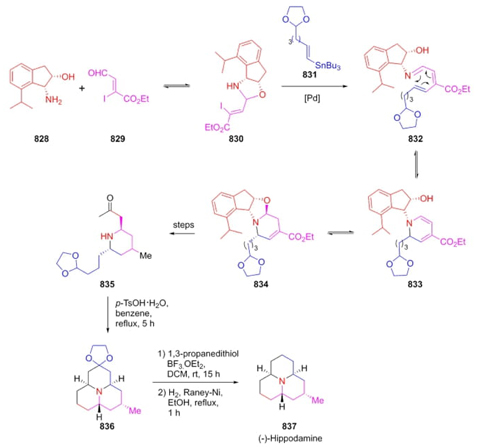 Katsumura et al. reported the first asymmetric total synthesis of (-)-Hippodamine by an unclassified three-component reaction as the first step [148]. Thus, after optimal conditions were found, a sequential combination of aminoalcohol 828, ester 829, and vinylstannane 831 under palladium catalyst achieved the product 834 in 81 % yield as single diastereoisomer (Scheme 123). It is proposed a mechanism pathway where reagent 828 in the presence of ester 829 allowed the formation of compound 830. Then, an addition of stannane 831 occurred to promote further aza-electrocyclization to give compound 833. Further sequential transformations such as hydrogenations, alkylations, and intramolecular Mannich reactions completed the synthetic methodology toward the natural product 837.