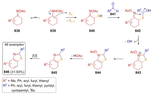 In 2019, Huang, Deng et al. developed a synthetic route to obtain naphthothiazoles 846 via a three-component reaction under catalyst and additive-free conditions [149]. A plausible reaction mechanism was proposed, where tautomerization of cyclohexenone oximes 838 provided the enamines 839 (Scheme 124). Then, elemental sulfur was attacked probably via a Willgerodt-Kindler process by compounds 839 to give the intermediates 840, which were annulated after the addition of aldehydes 841 to give intermediates 844. After releasing water and acetic acid, the intermediates 845 were obtained. Finally, it was oxidized with sulfur present in the medium affording the products 846 in moderate to good yields (31-93 %).