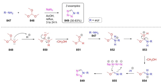In 2019, Lomas-Romero, Gonzalez-Zamora, Islas-Jacome et al. developed a procedure to synthesize a few symmetrical tetrazoles 849 through a non-named 3CR involving a heterocyclization as a key step [150]. Thus, a sequential combination of anilines 847, trimethyl orthoformate (848), and sodium azide gave the products 849 in moderate to good yields (30-83 %). The plausible reaction mechanism starts with the formation of activated carbonyl intermediate 851 from trimethyl orthoformate (848) (Scheme 125). This latter reacts with the amines 847 via a condensation reaction to give the dipoles 854 after releasing a molecule of methanol. Then, these later intermediates carry out a dipolar cycloaddition with azide anion to assemble the symmetrical tetrazoles 849. These compounds are potential linkers to fabricate tetrazole-based MOF-type materials. Tetrazole as a functional group is considered an isostere of carboxylic acid. In this context, tetrazole-based ligands have some advantages over carboxylate-based MOFs, like enhanced resistance to harsh conditions like higher temperatures, a wide range of pH, and a higher degree of humidity.