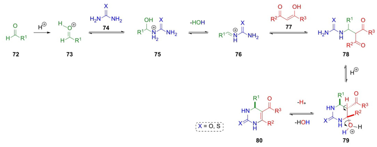 In 1893, Pietro Biginelli made possible another kind of a three-component reaction by protonation of carbonyl compounds 72. Then, protonated aldehydes 73 were combined with urea or thiourea (74) to give aminoalcohols 75, which after dehydration performed iminium ions 76. The addition of a β-ketoesters 77 (e.g. ethyl acetoacetate) achieves 3,4-dihydropyrimidin-2(1H)-ones 80 after a cyclization step of compounds 78 and dehydration of intermediates 79 (Scheme 13) [24]. Also, this kind of condensation could be catalyzed by many Brønsted or Lewis acids. Asymmetric synthesis of many dihydropyrimidinones has been also reported to develop new compounds with pharmaceutical interest [25].
