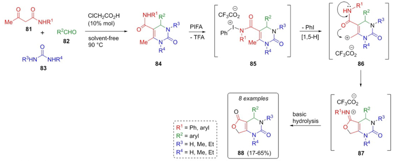 In 2010, Tellitu, Dominguez et al. developed an interesting methodology to achieve furo[3,4-d]pyrimidinones 88 using a Biginelli reaction as the key step [26]. After corresponding optimizations, 5-carboxamido-dihydropyrimidines 84 were afforded from 3-ketoamides 81, aldehydes 82, and urea-derivates 83 using chloroacetic acid as catalyst, under solvent-free conditions (Scheme 14). Compounds 84 in the presence of PIFA [phenyliodine(III) bis(trifluoroacetate)] promote formation of iodine complexes 85. Then, a 1,5-hydride shift achieved intermediates 86, where the allylic position was attacked by oxygen of amide fragment to give the iminolactones 87. Finally, a hydrolysis step developed corresponding furo[3,4-d]pyrimidine-2,5-diones 88 in moderate yields (17-65%). PIFA plays an important role in intramolecular oxycarbonylation. Also, electronic or steric effects into aryl groups promote the corresponding yields.