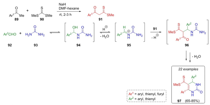 A closer work was reported by Singh et al. in 2010, where it was performed for the first time a silica-sulfuric acid-catalyzed Biginelli-type reaction [27]. It was proposed the use of β-oxodithioesters as β-dicarbonyl components. After corresponding optimizations, oxodithioesters 91, aldehydes 92, and urea (93) were combined with SiO2-H2SO4 as acid catalyst to generate the Biginelli-derivatives 97 in moderate to good yields (65-85%). It was proposed a plausible mechanism where condensation between aldehydes 92 and urea (93) performed iminium cations 95. After the addition of dithioester enols 91 (previously afforded through condensation between ketones 89 and thioate 90), an intramolecular cyclocondensation, and dehydration performed dihydropyrimidinones 97 (Scheme 15). It has been used different electron-withdrawing and electron-releasing substituents. The authors mentioned that it was unable to know the role of thiourea in thiocoumarin-derivatives. However, it is worth noting the role of silica-sulfuric acid to promote the involved cyclizations in this methodology.