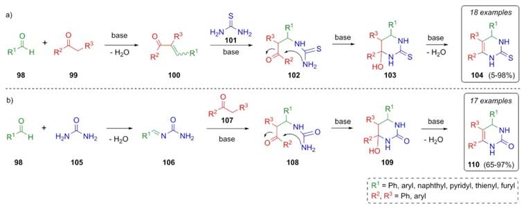 In 2010, Ji et al. reported the synthesis of a series of novel dihydropyrimidinones through a Brønsted-base (t-BuOK)-catalyzed Biginelli-type reaction [28]. In the first pathway, aldehydes 98 were combined with ketones 99 to give the compounds 100 under basic conditions. Then, the addition of thiourea (101) achieved intermediates 102, which after a ring closure afforded the compounds 103. Finally, a dehydration step performed the thiones 104 (Scheme 16a). In the second pathway, a condensation of aldehydes 98 and urea (101) gave the compounds 106. After the addition of ketones 107, cyclization of compounds 108, and dehydration of cyclic compounds 109, dihydropyrimidin-2(1H)-ones 110 were obtained (Scheme 16b). After several optimizations, two series of compounds were prepared depending on the reagents used. In the same way, the mechanism may take two different pathways in function of the reagents used (Scheme 16 a) thiourea, or b) urea), where the important intermediates are furnished after corresponding condensations in each pathway. It is important to note that this was the first Biginelli reaction developed under basic conditions.
