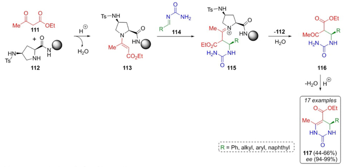 The search behind better organocatalysts with associated lower costs and toxicity, but even with enantioselective efficiency led to Moorthy and Saha developed a Biginelli reaction including mechanistic studies of sterically hindered organocatalysts (Scheme 17) [29]. After exhausting studies, it was found that catalyst 112 worked in high selectivity on Biginelli reaction from a series of electron-rich and electron-deficient aldehydes combined with ethyl acetoacetate (111) and urea to afford the products 117 in up to 66 % yields but in excellent enantiomeric excess (94-99 %). Mechanism pathway proposed involves condensation between catalyst 112 and dicarbonilic compound 111 to give the enamine 113. Then, nucleophilic attack from enamine 113 to iminoamides 114 performed pyrrolidinium cations 115. Finally, cyclization of precursors 116 achieved the products 117. Despite the moderate yields, the enantioselectivity found was good because the catalyst used is bulky and contains a proton donor group, which favors the re-facing attack of complex 113 towards the iminoamide 114.