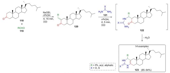 Gogoi, Baruah et al. developed an ultrasound-assisted Biginelli-type reaction [30] to efficiently synthesize some new 3,4-dihydropyrimidin-2(1H)-ones and 3,4-dihydropyrimidine-2(1H)-thiones. In this one-pot reaction, steroidal ketone 118 was combined sequentially with aldehydes 119, urea, or thiourea (121) using ultrasound conditions and sodium ethoxide as the base. Biginelli-species 123 were formed with excellent yields (85-94 %). It was proposed a plausible mechanism that proceeds through an aldol condensation between ketone 118 and aldehydes 119 to give the compounds 120, which through a nucleophilic attack by urea or thiourea (121) gave intermediates 122, which after releasing water furnished the steroids 123 (Scheme 18). It is well-known that ultrasound-assisted reactions have an important impact on green chemistry, giving added value to one-pot reactions. In the particular case of this work, ultrasound energy improved the yields probably due to mechanical stress in the process.