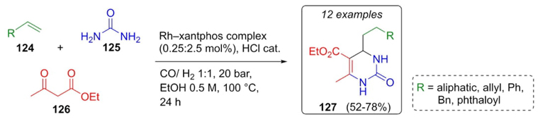 The synthesis of a dozen of new Biginelli compounds developed by Breit et al. involved the use of alkenes to generate aldehydes through a hydroformylation process catalyzed by a rhodium-xantphos complex [31]. After corresponding optimizations, alkenes 124 were combined with ethyl acetoacetate (126) and urea (125), HCl was added in catalytic amounts (Scheme 19). Functionalized dihydropyrimidones 127 were synthesized in moderate yields (52-78 %). Rh-xantphos catalyst usually used in hydroformylation reactions was employed here in a Biginelli reaction and by-products derived from carbonylation reaction were not observed, except when large chain alkenes 124 were used, resulting in low yields for the Biginelli products.
