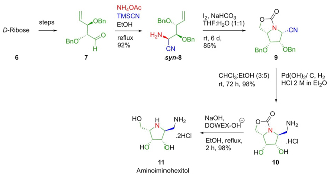 In 2011, Stocker et al. reported the synthesis of various aminoiminohexitols or azasugars (Scheme 2). Some of these compounds show glycosidase inhibitory activity. The synthesis starts from D-ribose 6. The key step of this methodology involved a diastereoselective Strecker reaction between the D-ribose-derived aldehyde 7, NH4OAc, and TMSCN to afford the α-aminonitrile 8 in excellent yield (92%). The major diastereomer was placed in syn configuration (syn/anti 8:1). Diastereomer 8 was isolated and then treated with NaHCO3 and I2 promoting carbamate annulation to afford the bicyclic compound 9. After hydrogenation, and deprotection it was achieved the compound 10. Finally, a hydrolysis of compound 10 completes the total synthesis of the aminoiminohexitol 11 in 36% overall yield [11]. It is worth noting the high stereoselectivity of the Strecker reaction as well as the absence of metal catalysts.