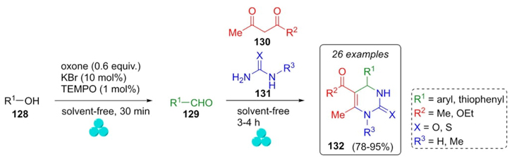 Another example of an eco-friendly methodology is the synthesis of Biginelli products under ball-milling assistance reported by Mal et al. in 2015 [32]. First, the aldehydes 129 were prepared through alcohols 128 oxidation under solvent-free conditions by ball-milling using a catalytic amount of oxone (peroxymonosulfate ion), KBr, and TEMPO [(2KHSO5·KHSO4·K2SO4)-2,2,6,6-tetramethylpiperidin-1-yl-oxy radical]. With aldehydes 129, and reagents 130 and 131 in hands, Biginelli reaction proceeded also under solvent-free conditions and using a ball-milling device to give products 132 in moderate to good yields (78-95 %) (Scheme 20). Acid subproduct in the oxidation reaction served as the catalyst in Biginelli reaction. Notably, this method employed electron-withdrawing and electron-releasing aldehydes to afford new dihydropyrimidones in a one-pot process. Also, regioselectivity was directed by using N-methyl urea to obtain just a single regioisomer.