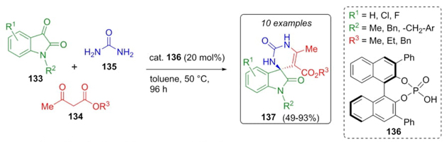 Silvani et al. developed an organocatalytic asymmetric method for the construction of spiro-compounds via a Brønsted acid-catalyzed Biginelli-type reaction [33]. Thus, isatin derivatives 133 were combined in a one-pot process with β-ketoesters 134 and urea (135) using the chiral organocatalyst 136 to give the spiro(indoline-pyrimidine)-diones 137 in moderate to good yields (49-93%) with moderate ee values (50-80%) (Scheme 21). This report was the first one to describe an asymmetric Biginelli-type reaction from ketones under acid-organocatalytic conditions in which 3,3’-positions of the catalyst have a strong influence on the yields and ee. Best yields and enantioselectivity were observed for the N-methyl isatin derivative rather than others with substituents like benzyl.