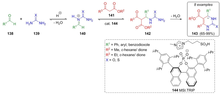 Amarante, Neto et al. developed a synthetic strategy where a chiral catalyst was used in a Biginelli reaction [34]. The catalyst 144 containing a chiral phosphoric acid moiety in ionic liquid media resulted in a creative method called Asymmetric Counteranion-Directed Catalysis (ACDC). Thus aldehydes 138 were combined with urea or thiourea (139) to give the intermediates 140. Further addition of keto-esters 141 to compounds 140, and dehydratation of precursors 142 gave good to excellent yields (65-99 %) and ee (37-99 %) of compounds 143. It was proposed that Biginelli reaction followed the iminium pathway (Scheme 22). The catalyst 144 was recovered in 95 % amount and reused many times. This feature joined to solventless conditions results in another example of an environmentally friendly multicomponent reaction toward heterocyclic compounds.