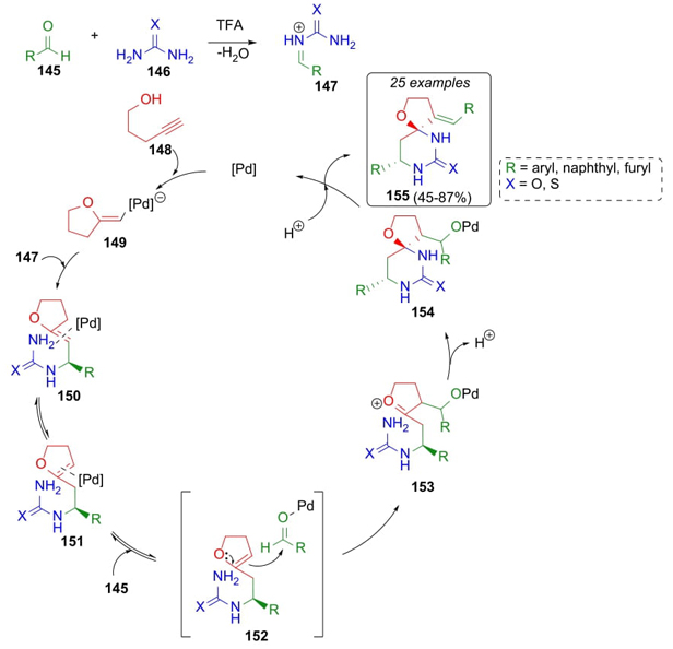 Yu, Ying et al. used a cyclic enol ether as the main reagent in a Biginelli reaction [35]. In this approach, it was necessary to optimize reaction conditions, being found as the best catalyst PdCl2 and trifluoroacetic acid as solvent. Sequential combination of aldehydes 145 with alkynol 148 and urea or thiourea (146) afforded the spiro-compounds 155 in moderate to good yields (45-87 %). A plausible mechanism involves a catalytic cycle involving the use of palladium (Scheme 23). As the first step, vinyl palladium complex 149 was trapped by N-acyliminium intermediates 147 through an intermolecular addition furnishing intermediates 150. Then, palladium catalyst promoted the formation of endocyclic enol ethers 151 via double bond isomerization. Enol ethers 151 perform a nucleophilic attack to aldehydes 145 to give the intermediates 152. After intramolecular cyclization of complexes 153, protonation, and dehydration of intermediates 154, the catalytic cycle was completed regenerating the palladium complex 149. Formation of spiro compounds was achieved in a combination of metal and Brønsted acid catalytic cycle in excellent enantioselectivity and with the best yields in a wide variety of electron-donating and withdrawing groups.