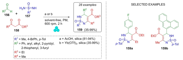 In 2021, Bolm et al. reported the synthesis of a series of dihydro-thiadiazine-oxides via a one-pot mechanochemical Biginelli-like process [36]. Optimal reaction conditions were found and were using acetic acid and silica gel as Brønsted and Lewis acids, respectively (Scheme 24). Thus, towards series a, aldehydes 156, sulfonimidamides 157, and ethyl acetoacetate (158) were placed in acetic acid/silica under mechanochemical conditions to afford products 159a in good to excellent yields (81-94 %). Then, toward series b, same starting materials were combined but under mechanochemical and solventless conditions to synthesize products 159b in moderate to excellent yields (35-99 %). Both series were obtained in a good diastereomeric ratio (up to 2:1). Aromatic and aliphatic aldehydes with releasing and withdrawing groups were used. Also, it is noteworthy the role of silica as a dehumidifier and partial-acidic agent at the grinding time.