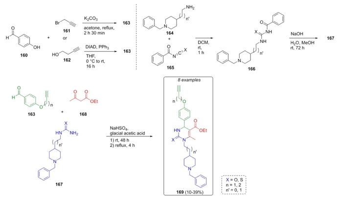 Ismaili et al. reported the synthesis of many new heterocyclic compounds via Biginelli reaction which were evaluated toward three different biological targets [37]. Thus, the key substrates were the alkynyl-aldehydes 163, which were synthesized previously through two routes: a) Williamson reaction between 4-hydroxybenzaldehyde (160) and propargyl bromide (161), and b) 4-hydroxybenzaldehyde (160) and alcohol 162 via a Mitsunobu reaction (Scheme 25). On the other hand, ureas 167 were prepared from benzylpiperidines 164 and benzoyl isocyanate or benzoylthioisocyante (165). Thus, aldehydes 163, ureas 167 and ethyl acetoacetate (168) furnished the compounds 169 in moderate yields (10-39 %) making use of sodium bisulfate as catalyst. These kinds of compounds have potential activity as Ca2+ channel blockers, cholinesterase inhibitors, and activators of nuclear erythroid 2-related factor 2.