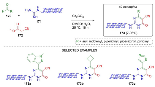 Qi, Peng et al. developed a innovative strategy in which DNA-derivatives were obtained [38]. After optimization of reaction conditions, aromatic and heterocyclic aldehydes 170, DNA-conjugated guanidine 171, and methyl cyanoacetate (172) were sequentially combined using cesium carbonate as the base to achieve DNA-dihydropyrimidinones 173 in low to good yields (7-96 %) (Scheme 26). Thus, isocytosine scaffolds were developed taking advantage of DNA-conjugated guanidine fragment. A variety of electron-donating and releasing groups were tolerated in such reactions even 5-membered heteroaromatic compounds participated therein. It is important to highlight that this is the first report in which a DNA-amine fragment was used in an organic reaction.
