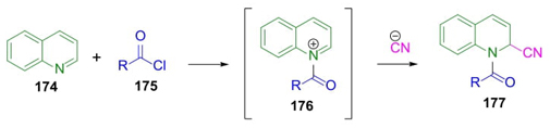 Cooney’s manuscript from 1982 described that Arnold Reissert reported in 1905 a multicomponent reaction involving combinations of quinoline with acyl chlorides, and potassium cyanide in aqueous media (Scheme 27) [39]. Thus, the formation of N-acyl quinoliniums 176 by the reaction of quinoline (174) and acyl chlorides 175 is followed by cyanide anion addition to promote the formation of the Reissert products 177. The preparation of such compounds in aqueous media has some common complications. For instance, the low solubility of the reagents because of their different polarity that may be solved by using mixtures of solvents. Reissert reaction works well on a wide range of pyridine-containing reagents, acyl chloride-derivatives, and different kind of nucleophiles [40].