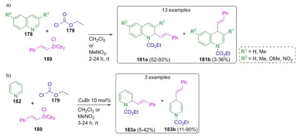 Reissert-type reactions have been developed using a variety of nucleophiles instead of cyanide anions. Thus, Saito, Hanzawa et al. reported a methodology where alkenylzirconocene chloride was used as a nucleophile in a Reissert-type 3CR (Scheme 28(a)) [41]. This synthetic methodology consisted of a sequential combination of quinoline derivatives 178 or pyridine (182), styrylzirconocene 180 and ethyl chloroformate (179) in dichloromethane or nitromethane to give quinoline- or pyridine-containing products 181 or 183, respectively, in moderate to good yields (up to 93 %). The use of nitromethane instead of dichloromethane as the solvent improved the 1,2-additions on the quinoline derivatives. However, the use of nitromethane in the reaction of pyridine afforded a mixture of regioisomers with a poor 1,2-addition selectivity (Scheme 28(b)). On the contrary, the 1,4-addition was improved by employing a catalytic amount of CuBr (10 mol%) at -78 °C to the pyridine, whilst using quinoline derivatives irrelevant selectivity was found (Scheme 28).