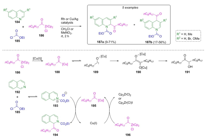 Later in 2013, Saito et al. continued developing a similar strategy, finding that the orientation of the reaction can be controlled by the addition of copper or rhodium catalysts (Scheme 29) [42]. Thus, a sequential combination of polysubstituted quinolines 184, acylzirconocene chloride (186), and ethyl chloroformate (185) under copper iodide (I) or rhodium/silver catalysts afforded a mixture of regioisomeric products 187 in moderate to good yields (up to 71 %). A mechanism pathway was proposed where chloride 186 was coordinated with Cu(I) to give the complex 188 which performed compound 191 after the formation of carbene 189 and its precursor 190. Thus, there is an equilibrium between the addition of isoquinoline (192) and chloride 185 with N-acylisoquinolinium 193 and acylated product 194. Acyl cooper product 195 was carried out through acyl transfers from the chloride 196 to Cu(I). In the case of the combination of rhodium (2.5 mol%) and silver (5 mol %) catalysts, it was promoted 1,2-addition in nitromethane as solvent. Instead that, under copper catalyst (10 mol %), 1,4-addition is promoted in dichloromethane. Then, N-acylation of isoquinoline occurred at the 2-position through an addition of the corresponding nucleophile.