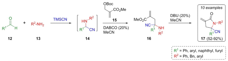 A tandem Strecker-Lewis base-catalyzed reaction was employed by Liao et al. in the synthesis of γ-lactams [12]. As the first step, amino nitrile intermediates 14 were achieved through a sequential combination of aldehydes 12, amines 13, and TMSCN under basic conditions generated in situ (Scheme 3). Then, functionalization of amino nitriles 14 via allylic alkylation was furnished by reacting with methyl acrylate 15 to provide the precursors 16. Thus, the new γ-lactams 17 were synthesized in moderate to good yields (52-92 %) from the intermediates 16 through the assistance of DBU in acetonitrile as solvent. This Strecker reaction was an excellent option for synthesizing highly functionalized aminonitriles that for the allylic-alkylation-cyclization strategy is regioselectively driven by polar solvents such as acetonitrile.
